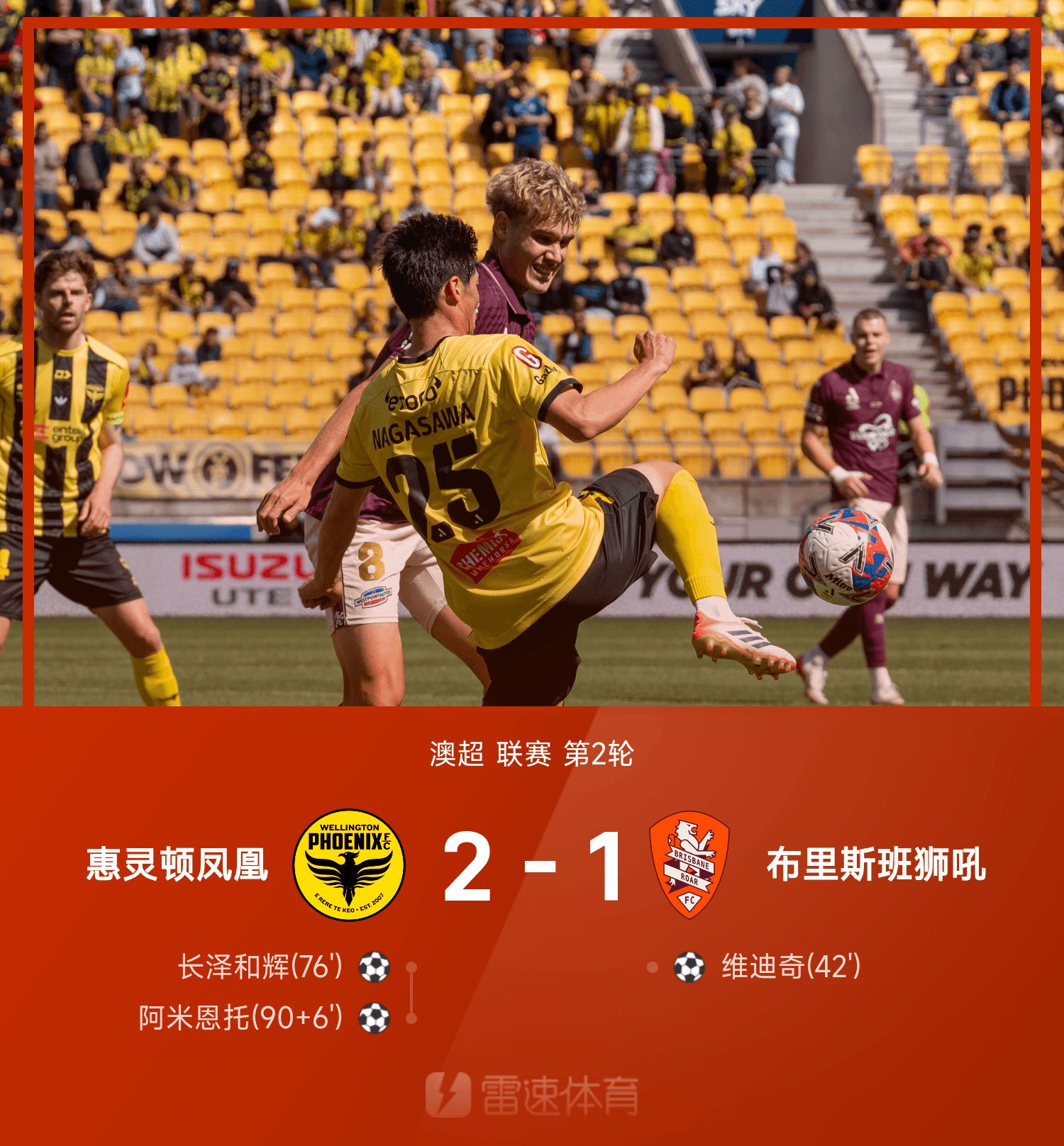 6686體育10月26日訊 25/26賽季澳超聯賽第2輪,威靈頓鳳凰城2-1擊敗布里斯班獅吼。上半場競賽,維迪奇抓住詹姆斯差錯機會取得進球。下半場長澤和輝搶點破門扳平賽果分,阿米恩托補時最後一投弒舊主。