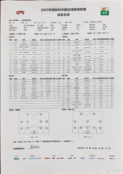 山東泰山先發陣容:14-王大雷、5-鄭錚、33-高準翼、55-彭嘯、11-劉洋、35-黃政宇、8-馬德魯加、10-卡扎伊什維利、9-克雷桑、19-澤卡、38 -李小恆