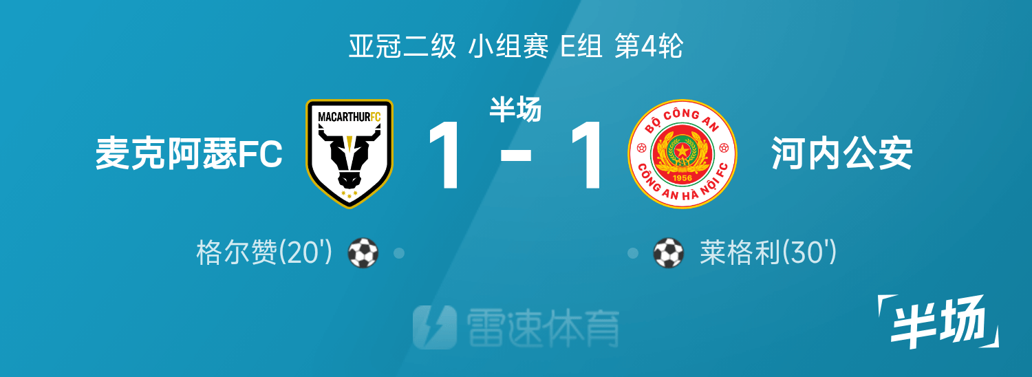 亞冠二級半場:格爾贊破門,萊格利扳平局,麥克阿瑟1-1河內