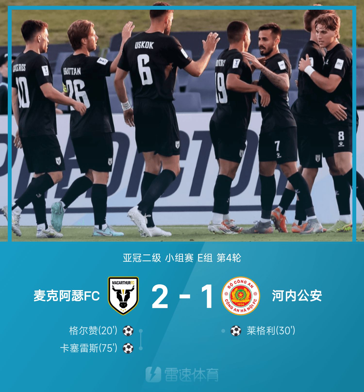 6686體育11月06日訊 25/26賽季亞冠二級分組賽E組第4輪,麥克阿瑟FC主隊場以2-1力克河內公安。上半時競賽,格爾贊為麥克阿瑟首開紀錄,萊格利扳平,雙方打成1-1;下半時競賽,卡塞雷斯打進致勝球。麥克阿瑟以7分在小組領跑,河內以5分仍暫列小組第二。