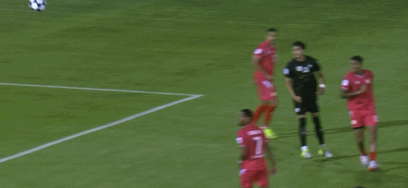 12’河內將自由球主罰到三秒區內,萊格利頭槌被守門員直接得到