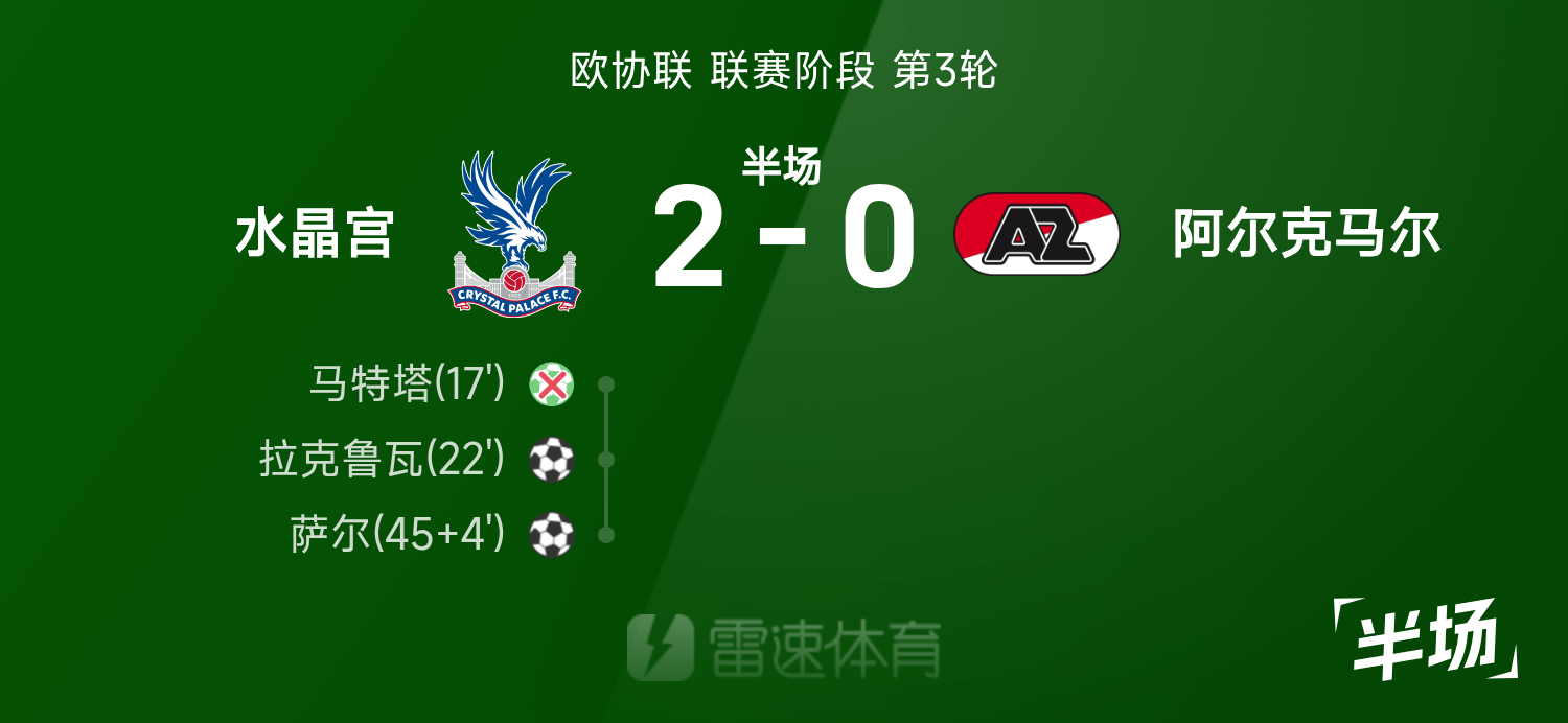 歐協聯半場:馬特塔失點,拉克魯瓦傳出,水晶宮2-0阿爾克馬爾