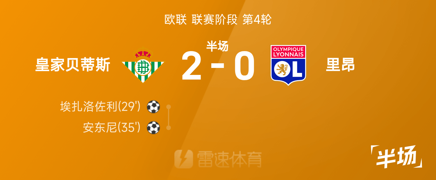 歐聯半場:安東尼單刀破門,皇家貝蒂斯暫時2-0里昂