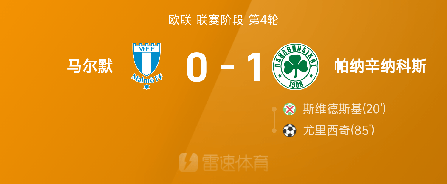 6686體育11月07日訊25/26賽季歐聯聯賽事階段第4輪,帕納辛納科斯1-0擊敗馬爾默,尤里西奇第85分鐘上演最後一投。全場競賽,尤里西奇破門建功,斯維德斯基失點。