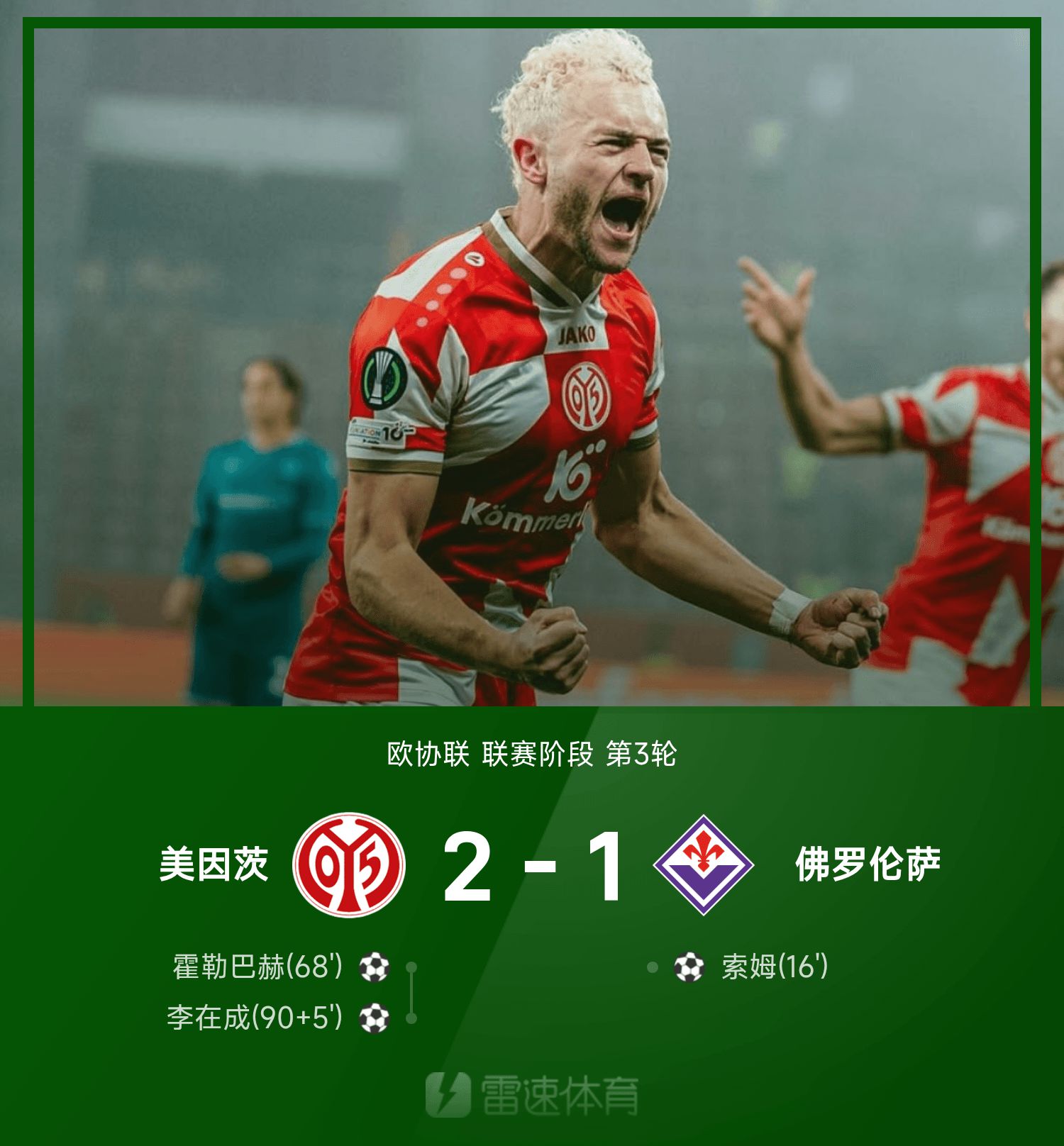歐協聯戰報:李在成頂球最後一投,美因茨2-1佛羅倫斯