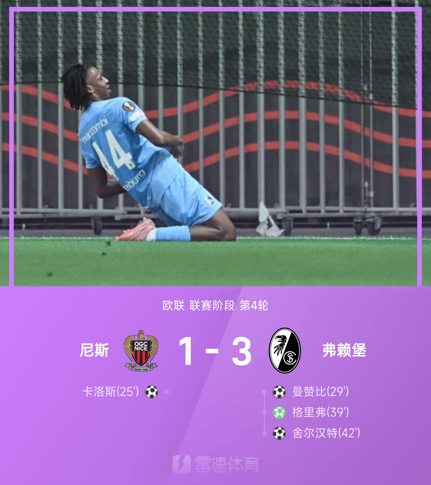 6686體育11月7日訊 25-26賽季歐聯聯賽事階段第4輪,尼斯主隊場迎戰弗賴堡。此役上半場,卡洛斯單刀破門首開紀錄,曼贊比抽射建功扳平賽果分,格里弗主罰十二碼命中,舍爾漢特推遠角再入一球。易邊再戰,雙方均未破門。全場競賽終結,弗賴堡3-1擊敗尼斯。