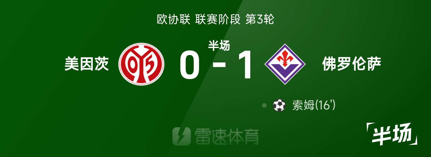 歐協聯半場:索姆破門,美因茨0-1佛羅倫斯