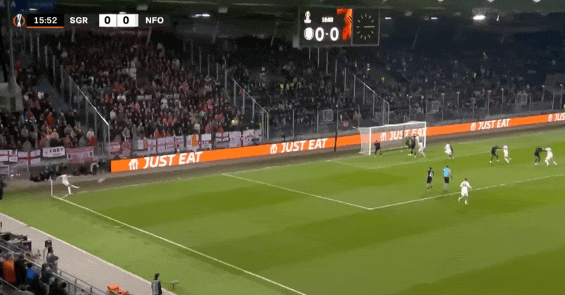 10’森林隊前場威脅定位球,麥卡蒂迎球推遠角稍微偏出立柱