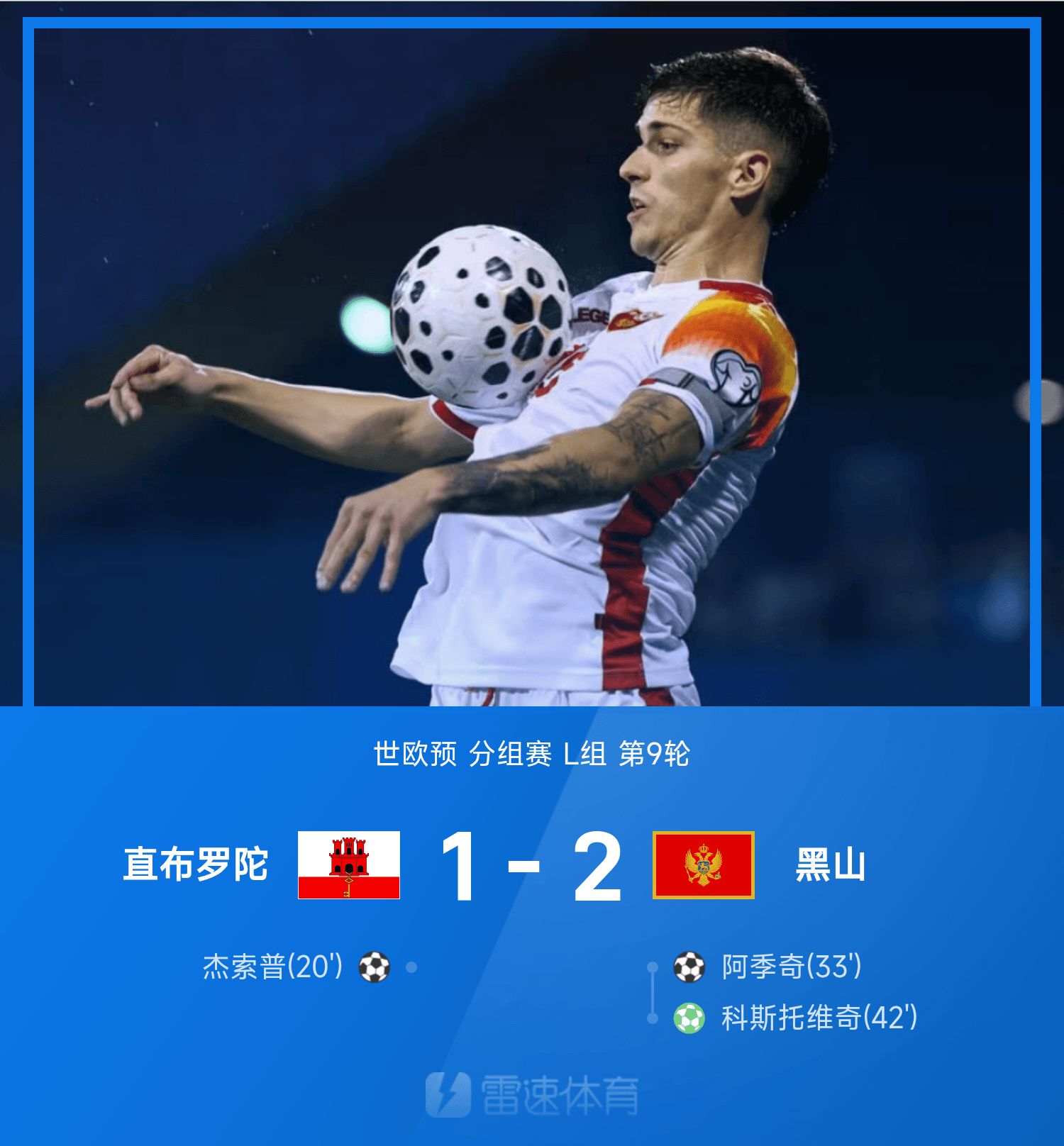 6686體育11月15日訊 世歐預分組賽L組第9輪,直布羅陀坐鎮主隊迎戰黑山。此役上半場,傑索普單刀破門,阿季奇主罰自由球建功扳平手賽果分,科斯托維奇點射命中。易邊再戰,雙方均未破門。全場競賽終結,黑山2-1直布羅陀。