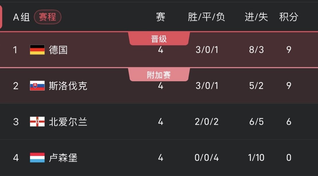 德國與斯洛伐克同積9分,他們將在最後一輪直接對話。在此之前,兩隊還需分別對上盧森堡和北愛爾蘭。