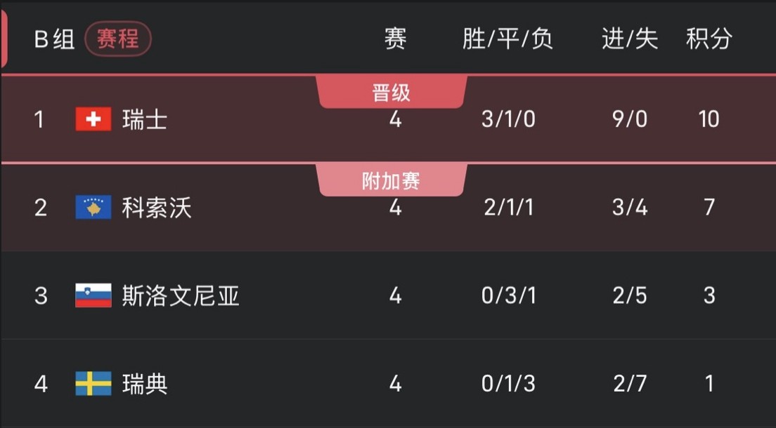 瑞士若擊敗瑞典,且科索沃未能戰勝斯洛維尼亞,即可出線。