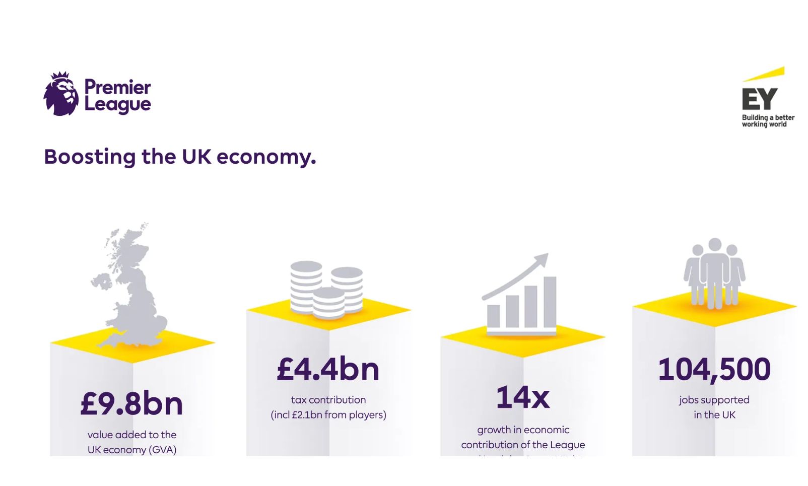 安永會計師事務所對2023/24賽季的評估顯示,英超聯賽事及其俱樂部為英國經濟創新了98億英鎊的附加價值。比2021/22賽季成長了21%,比1998/99賽季高出14倍以上。鑽研還發現,英超聯賽事支持了超過10萬個全職工作崗位,並貢獻了44億英鎊的稅款,其中包括球員和工作人員繳納的21億英鎊——這些收入協助資助了英國各地的公共服務。
