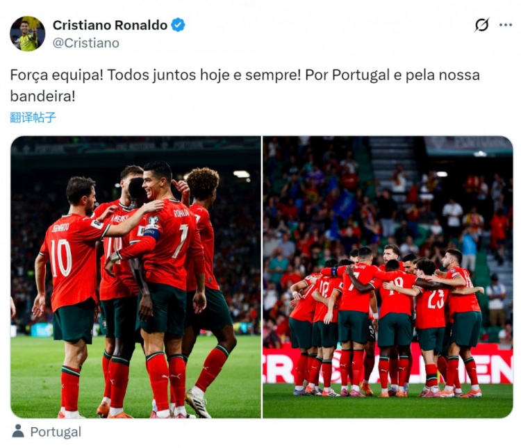 C羅寫道:「加油葡萄牙!今天到永遠,我們團結一心!為了葡萄牙,為了我們的國旗而戰!」