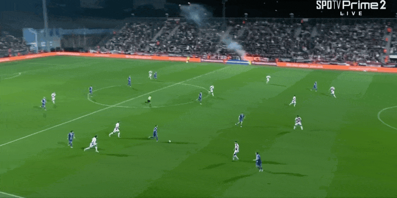 39’莫德里奇三秒區外嘗試一腳兜射,皮球稍微偏出死角