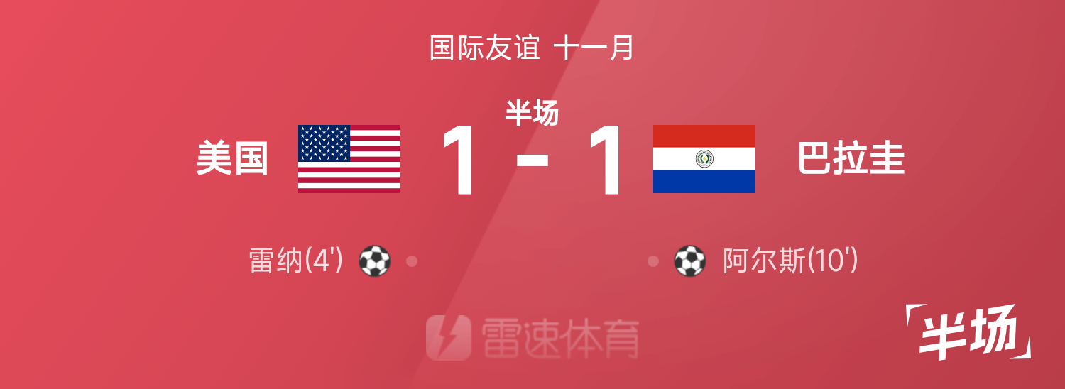 友誼賽半場:雷納閃擊,阿爾斯扳平,美國暫1-1巴拉圭