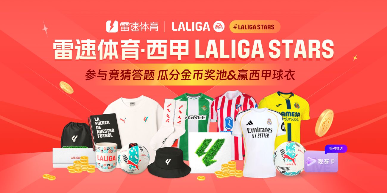 (1)活動依2025/26賽季西甲聯賽38輪賽程,共分為38期,每一期設定3道競猜問題供用戶作答; (2)用戶可任意參與每題競猜,每題目僅可選擇一個選項作答,確認無誤後點擊題目下方的【參與】按鈕提交,提交後不可更改選項; (3)每期活動的金幣獎池由用戶累計投入的的金幣數及官方提供的88888金幣兩部分組成; (3)每題目作答將耗費10金幣(金幣可從APP內簽到、每日任務、充值等方式取得); (4)每期每題目相互獨立計算獎勵,每期活動終結後,每道題目回答對的的用戶將平均瓜分該題目累計的金幣獎池。在相同的金幣獎池下,每位中獎用戶獲得的金幣的比例相同,中獎人數越少瓜分的金幣越多。 (1)每期活動答對1題可額外獲得1張觀賽券,全部答對獲得3張; (2)若每期活動3題目全部回答對的,我們將隨機抽取3位用戶獲得西甲官方提供的正品隊服、足球或雷速官方禮盒; (3)用戶可以透過【活動頁面-我的記錄】查詢個人的參與和結算獎勵詳情。 快來參與競猜答題贏取西甲官方好禮吧!目前,6686體育已獲2025/26賽季西班牙足球甲級聯賽事新媒體視訊直播版權,我們將持續為您帶來全新的觀賽體驗。 上雷速,看西甲直播!