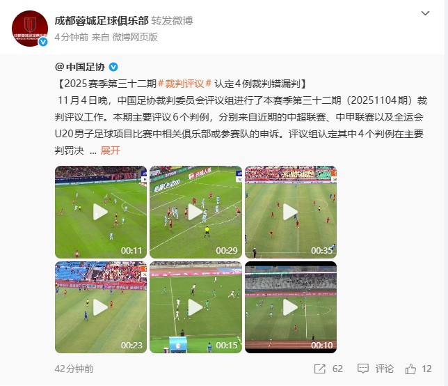無聲的抗議?成都蓉城官博轉發足協評議認定成都遭錯漏判內容