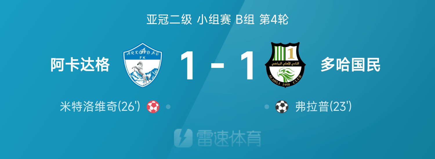 6686體育11月05日訊 25/26賽季亞冠二級分組賽B組第4輪,阿卡達格vs多哈國民。上半場,弗拉普破門建功,米特洛維奇自擺烏龍。下半場,雙方均無建樹。最終,阿卡達格1-1戰平多哈國民。