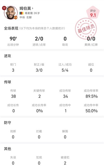 姆伯莫戰布萊頓全場數據:梅開二度,傳接勝利率89.5%
