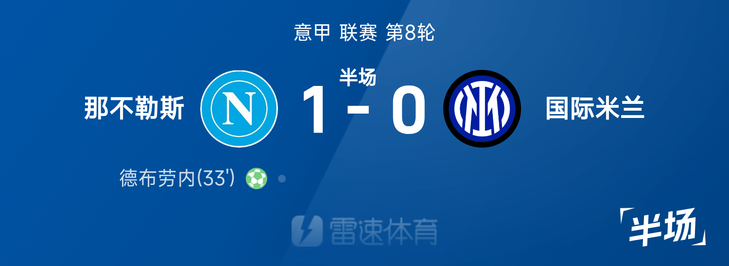 義甲半場:德布勞內點射後傷退,那不勒斯1-0國米