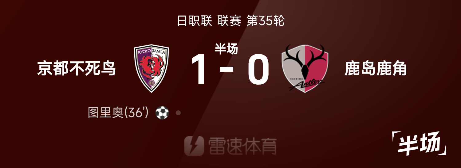 日職聯半場:圖裡歐破門,京都不死鳥暫1-0鹿島鹿角