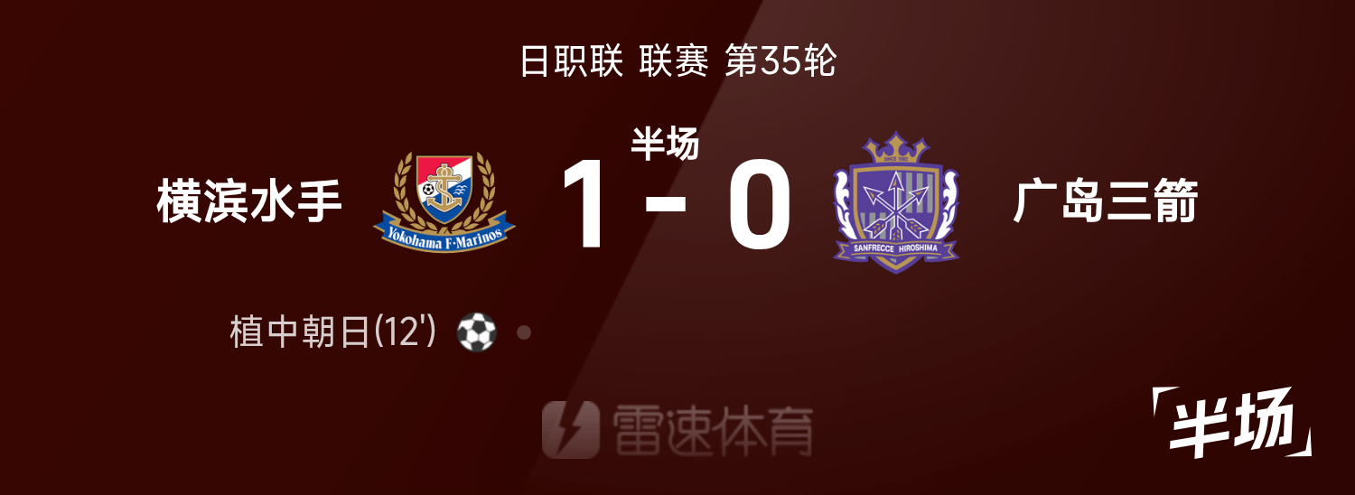 日職聯半場:植中朝日建功,橫濱水手暫1-0廣島三箭
