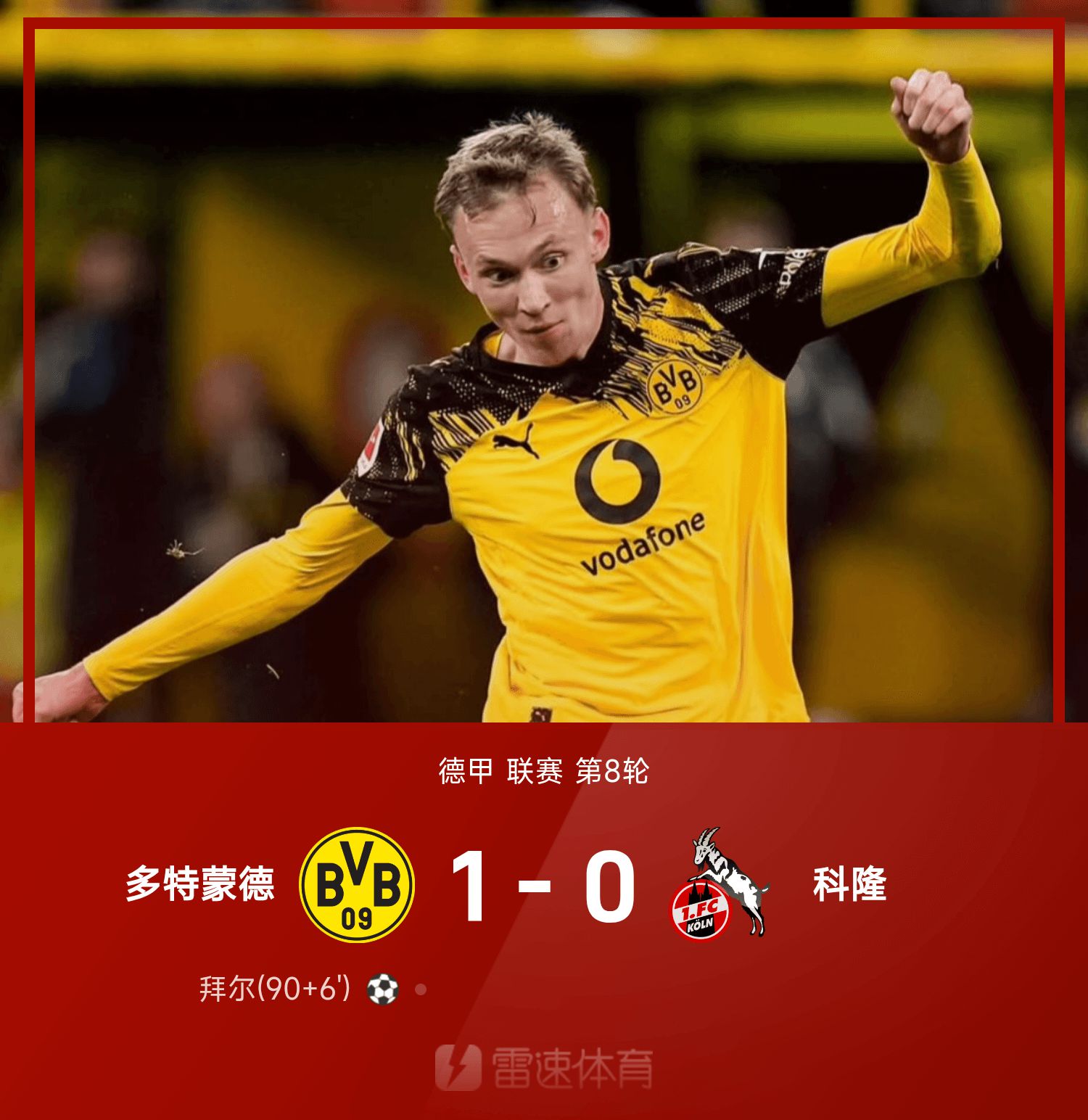 6686體育10月26日訊 25/26賽季德甲聯賽第8輪,多特蒙德1-0戰勝科隆,拜爾第90+6分鐘上演最後一投。全場競賽,拜爾補時破門最後一投制勝,科隆守門員斯克韋伯屢獻神撲難救主,賽義德·馬拉屢失良機。