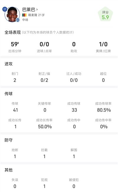 6686體育10月26日訊 英超第九輪,布萊頓客隊場挑戰曼聯。本場競賽布萊頓防守中場巴萊巴首發出戰,但競技狀態低迷,擋射門意識和守衛到位率都很低,在競賽第59分鐘,被老隊員米爾納換下。當巴萊巴下場時,布萊頓已經0-2跟跑位。