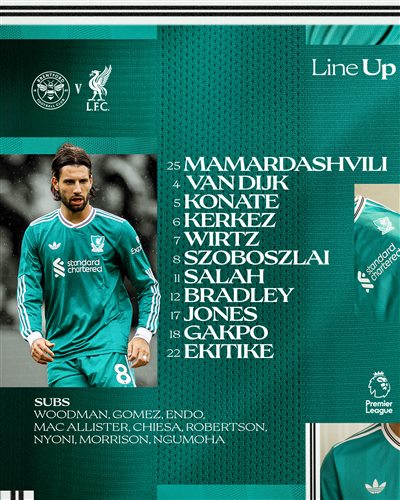 利物浦首發:25-馬馬爾達什維利、4-範戴克、5-科納特、6-凱爾凱茲、12-布拉德利、8-索博斯洛伊、17-瓊斯、18-加克波、7-維爾茨、11-薩拉赫、22-埃基蒂克