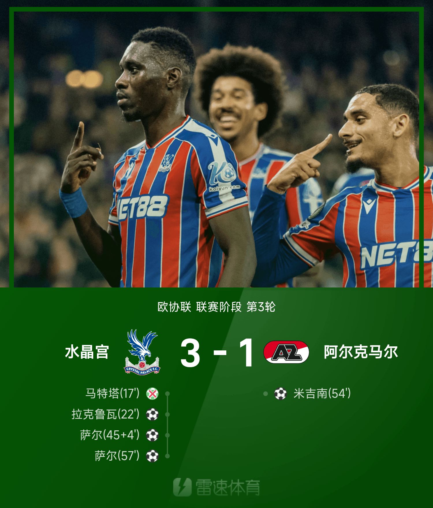歐協聯戰報:薩爾雙響,馬特塔失點,水晶宮3-1阿爾克馬爾