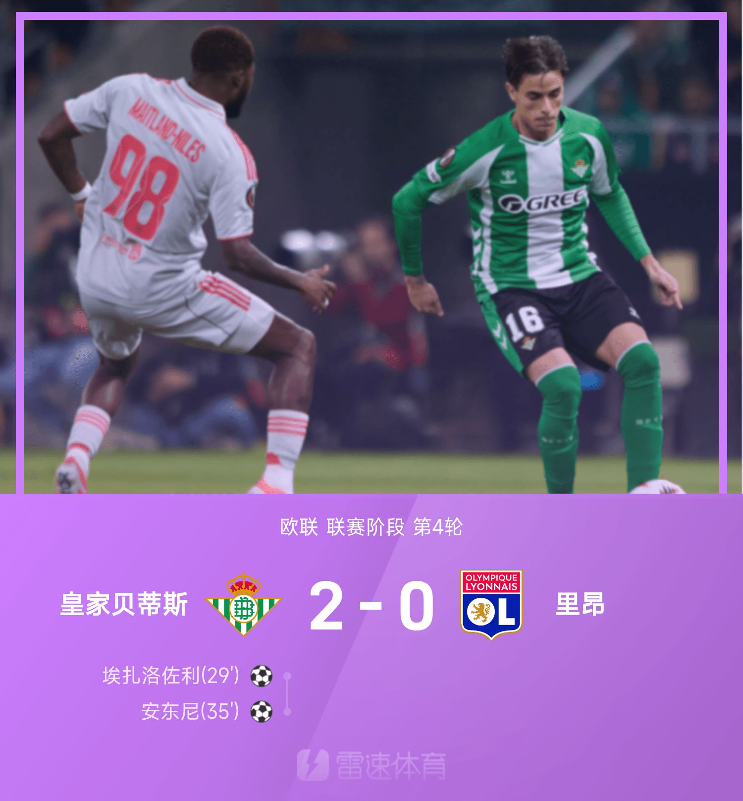 6686體育11月07日訊 25/26賽季歐聯聯賽事階段第4輪,皇家貝蒂斯對上里昂。上半場第29分鐘,巴坎布助攻埃扎洛佐利搶點破門,皇家貝蒂斯先拔頭籌。第35分鐘,羅卡自由球起大腳傳,安東尼形成單刀冷靜調射將賽果分改寫成2-0。下半場兩隊均無建樹,最後皇家貝蒂斯在主隊場以2比0擊敗里昂。