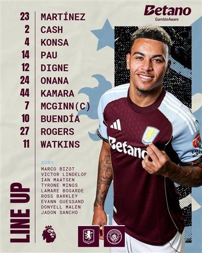 阿斯頓維拉先發陣容:23-馬丁內斯、12-迪涅、4-孔薩、2-卡什、14-托雷斯、7-麥金、10-布恩迪亞、44-卡馬拉、24-奧納納、27-羅傑斯、11-沃特金斯