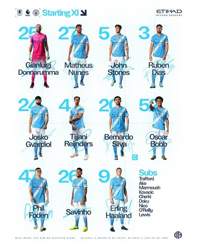 曼城先發陣容:25-多納魯馬、5-斯通斯、3-迪亞斯、27-努內斯、24-格瓦迪奧爾、20-B-斯通斯、3-迪亞斯、27-努內斯、24-格瓦迪奧爾、20-B-Banden、47-福鮑登、46-96-86-196-96-106-96-106-86-106-86-606-66-06-66-66-06-6-伯