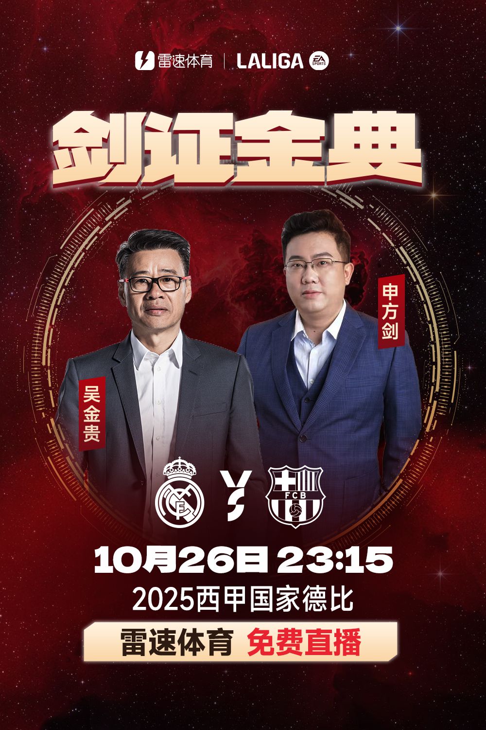 北京時間10月26日23:15,西甲第10輪,皇家馬德里將在主隊場迎戰巴塞隆納,這將是本賽季首次西班牙德比國家德比。 6686體育將免費視訊直播這場焦點對決,並非常榮幸地邀請到了兩位特殊嘉賓擔任本場競賽的解說,分別為知名教練員吳金貴以及著名解說員申方劍。