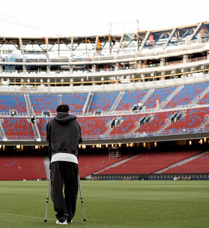 隨後,加維在社群媒體上分享了一張自己拄著拐杖踏入諾坎普的照片。
