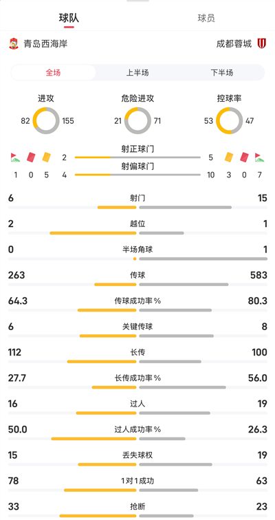 青島西海岸vs成都蓉城全場數據: