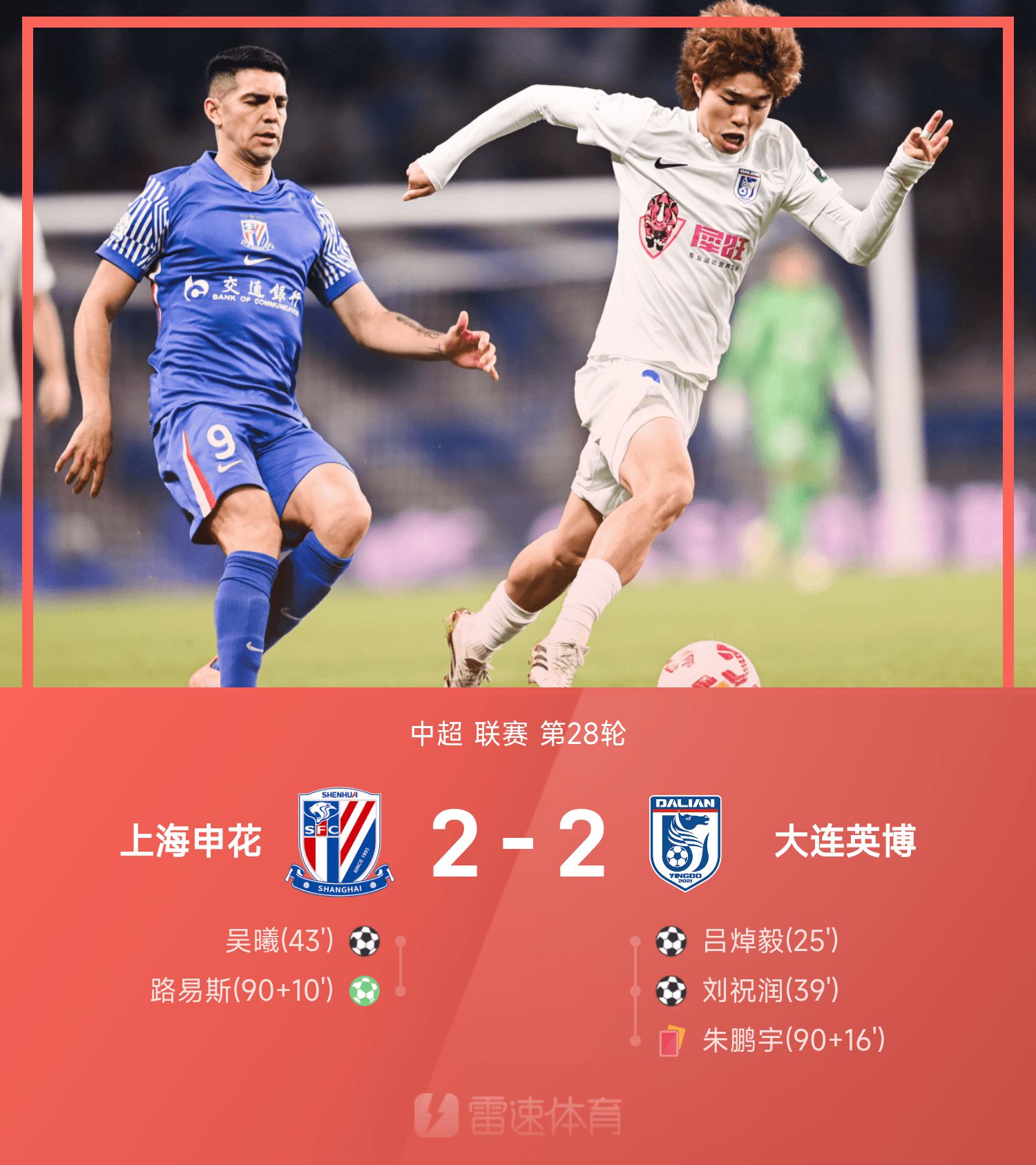 中超戰報:吳曦建功+造點、路易斯補時絕平,申花2-2英博
