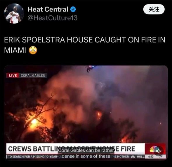 6686體育11月6日訊 今日,據美媒Heat Central報道,熱火主帥斯波爾斯特拉家中突發嚴重火災,NBC在報道中可以確定這位帥的家。