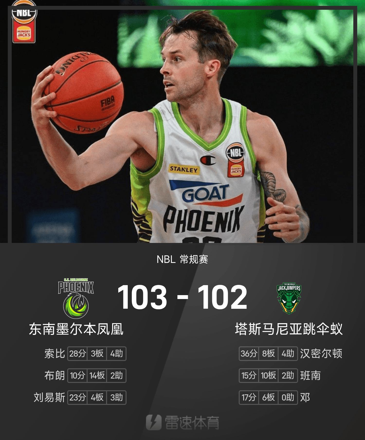 NBL戰報:索比28分,東南墨爾本鳳凰103-102險勝塔斯馬尼亞跳傘蟻