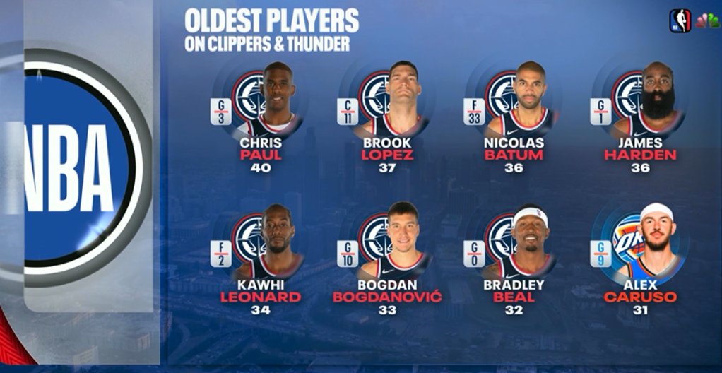 轉播本場競賽的電視台對比了雷霆和快艇球員的年齡,兩隊球員中前七老的球員都在快船,卡魯索是雷霆年紀最大的,但是也才31歲。