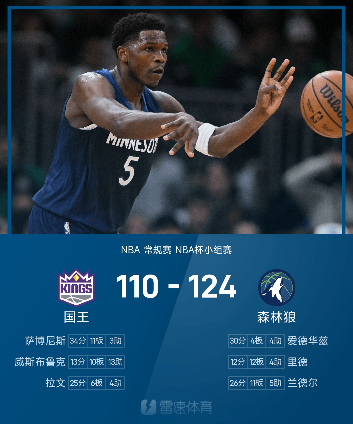 NBA戰報:愛德華茲30分,灰狼124-110擊敗國王