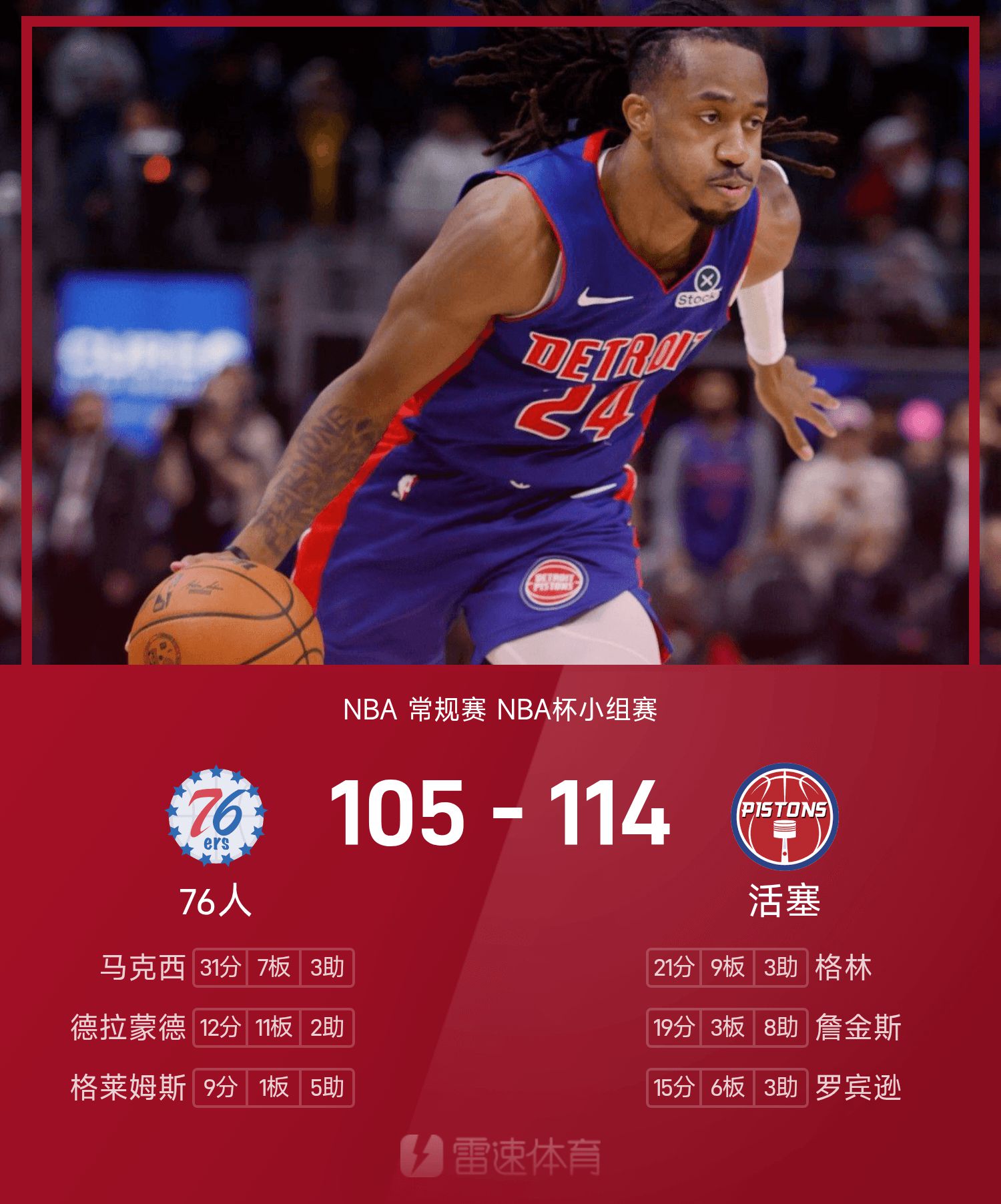 三分球8中5,詹金斯19分3板8助攻率領缺少康寧漢姆的活塞戰勝76人,馬克西空砍31分7搶籃板3助攻。