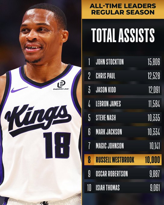 目前,國王球員威少已達成生涯10,000次助攻的成就,這是NBA史上第八名達此數據的球員。