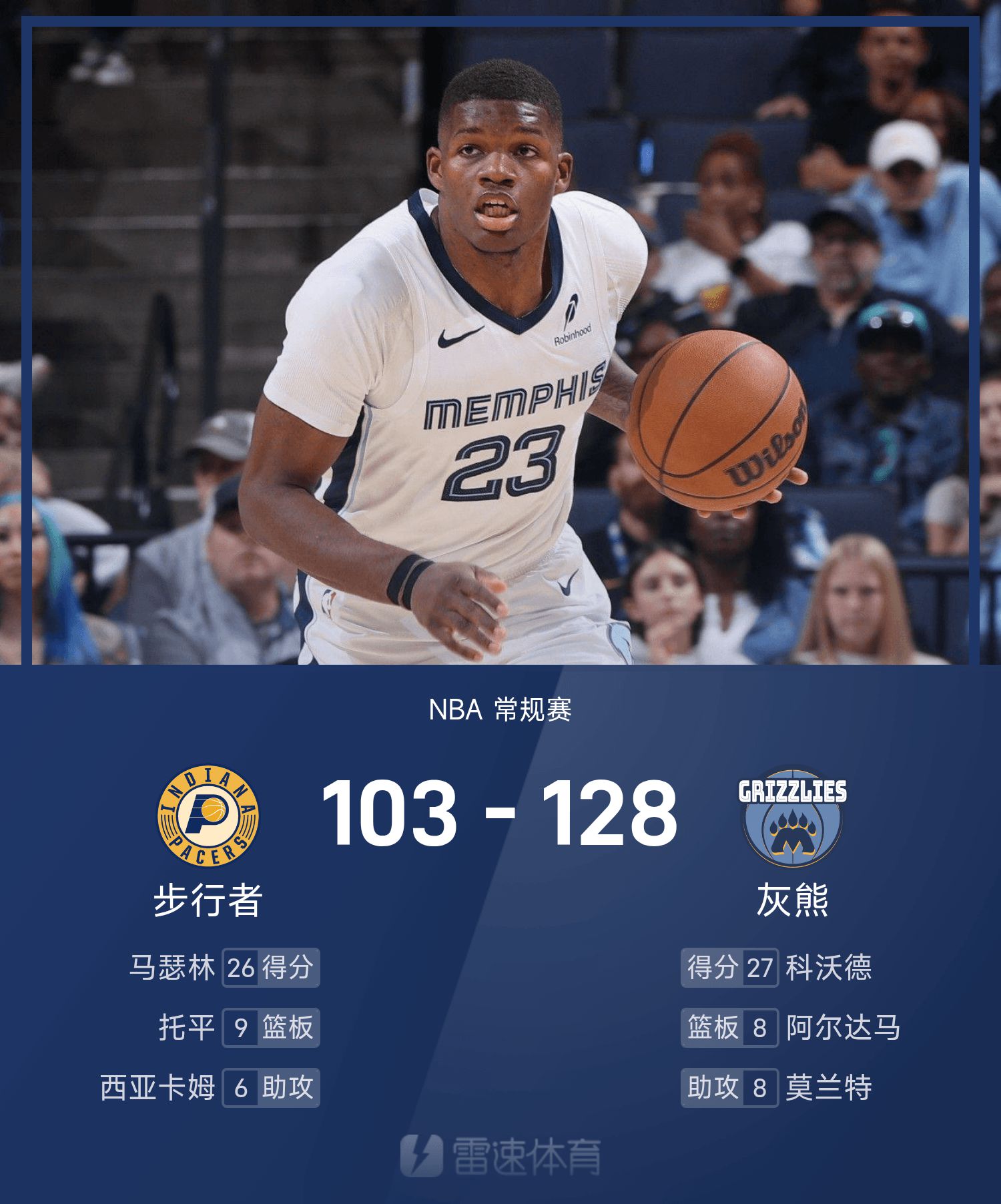 NBA戰報:科沃德27分6板,灰熊128-103大勝步行者