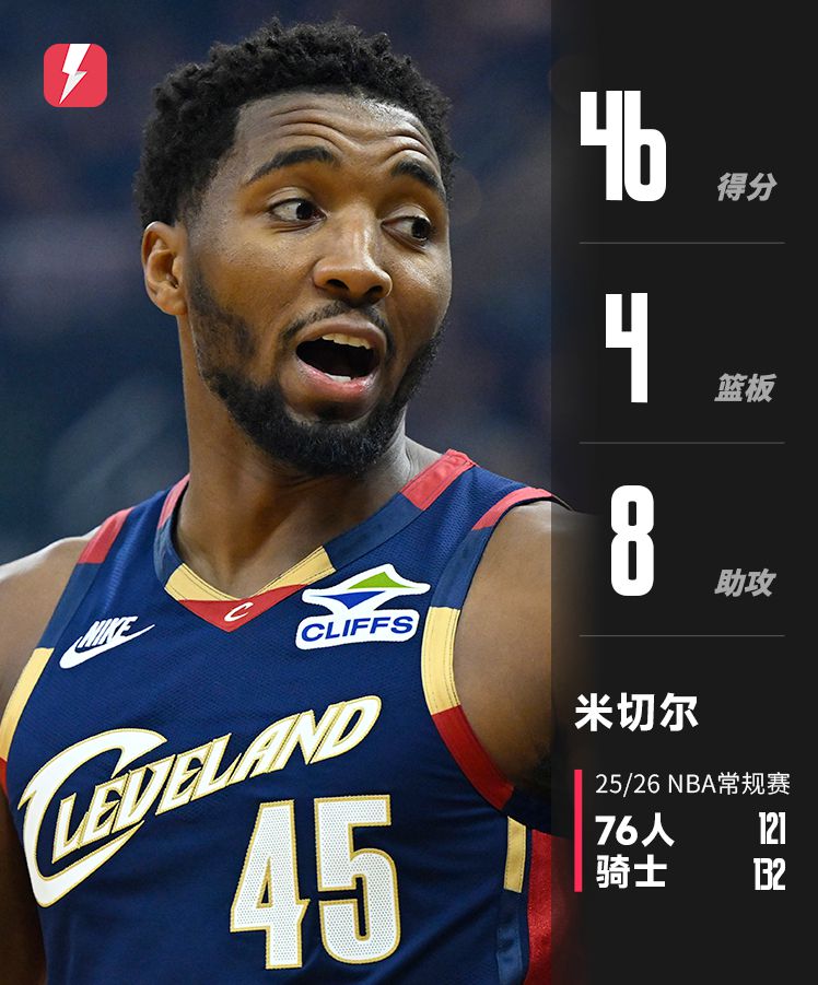 競技狀態火熱!騎士球星米切爾狂砍46分8助攻,得分賽季新高!