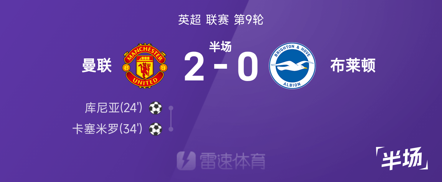 英超半場:庫尼亞拿下紅魔鬼處子球,曼聯暫2-0布萊頓