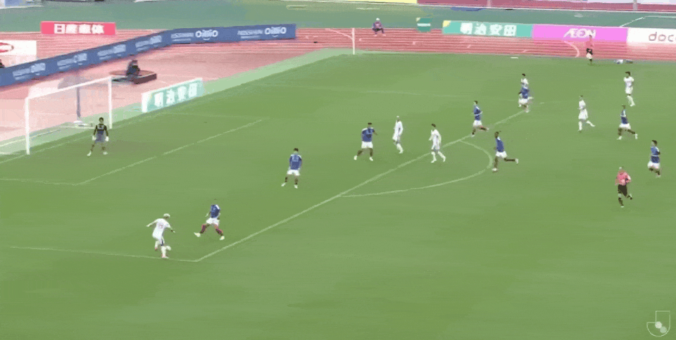 2’菅大輝定位球開向三秒區,佐佐木翔頂球攻門偏出