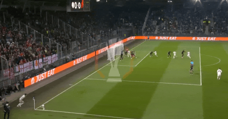 10’森林隊前場威脅定位球,麥卡蒂迎球推遠角稍稍偏出立柱