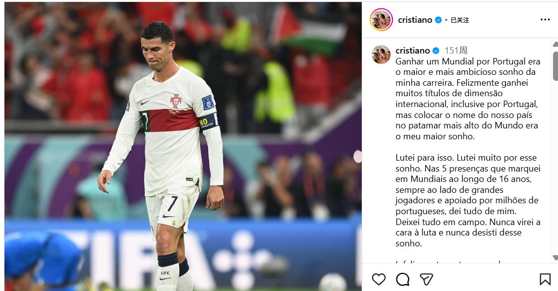 不過,C羅在2022年卡達世界盃終結後的觀點與現在大相逕庭。在葡萄牙爆冷不敵摩洛哥出局後,C羅在社群媒體上發文表示,為葡萄牙贏得世盃賽冠軍是自己職業生涯最偉大的夢想,而且自己從未放棄過這個夢想。