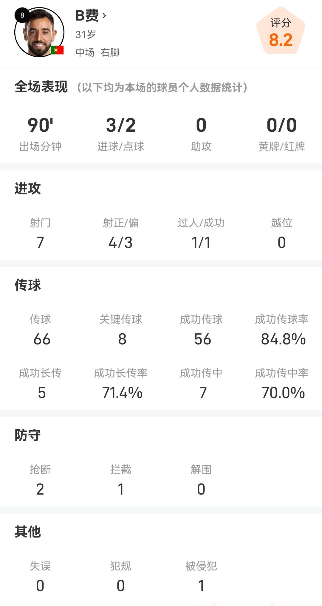 本場競賽,B費首發出賽並打滿全場,表現十分出色。在攻擊端,B費打進了3球,全場競賽共有7次打門,其中4次射正,還有1次勝利過人。